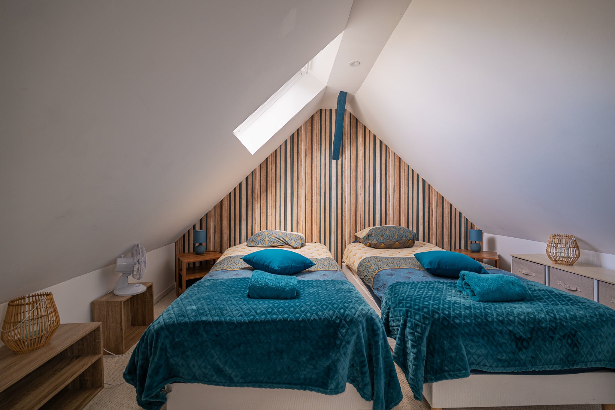 Un premier escalier mène à une suite spacieuse avec sa salle d'eau, un second escalier mène à une chambre avec sa salle d'eau attenante.