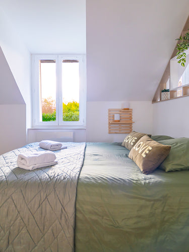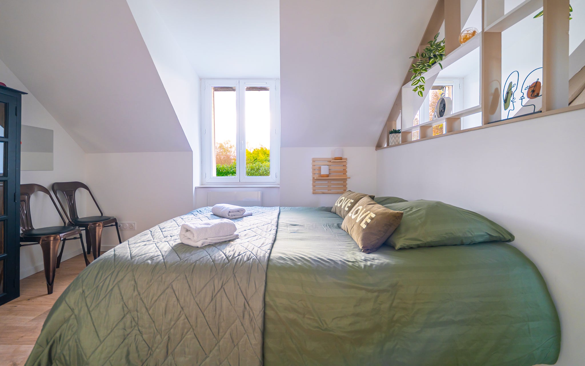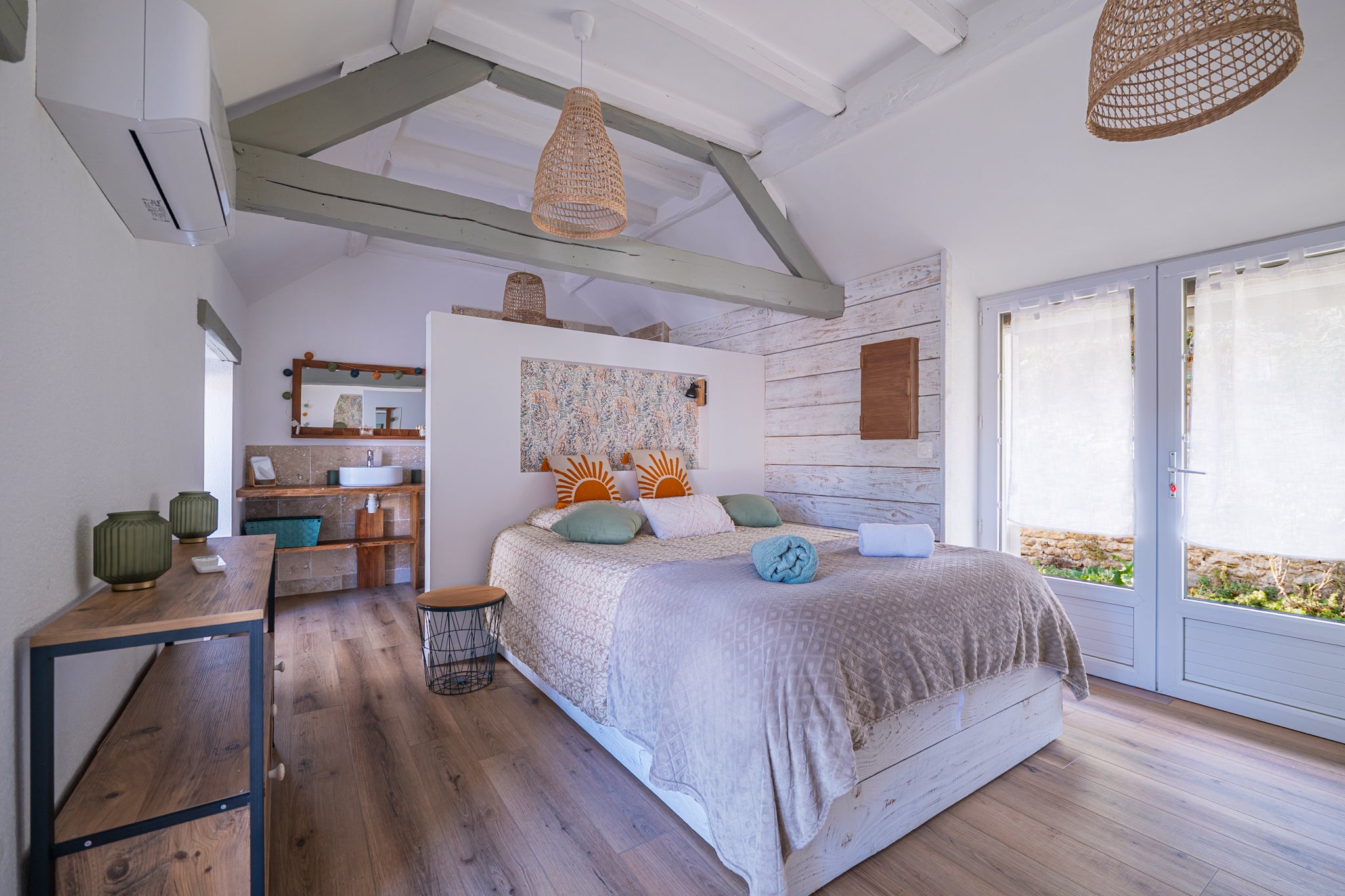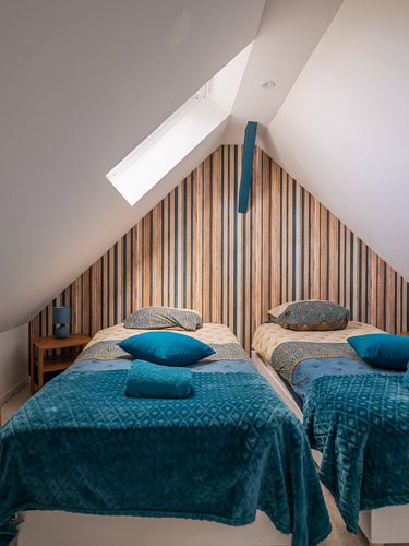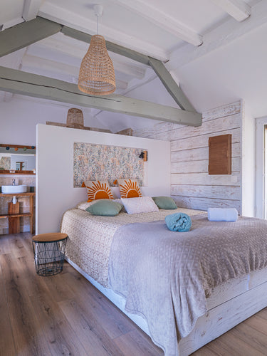 Un premier escalier mène à une suite spacieuse avec sa salle d'eau, un second escalier mène à une chambre avec sa salle d'eau attenante.